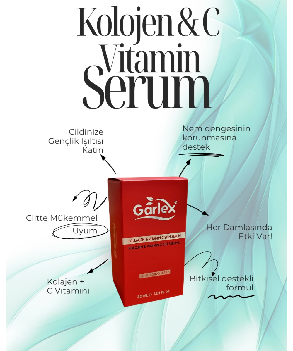 Garlex Kolajen & C Vitamini Serumu, cildin esnekliğini, canlılığını ve nem dengesini desteklemek amacıyla formüle edilmiştir. İçeriğindeki C Vitamini, Hyaluronik Asit ve bitkisel ekstraktlar sayesinde cildin daha sıkı, parlak ve bakımlı görünmesine katkıda bulunur.