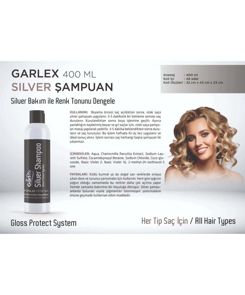 Garlex Silver Şampuan, gri ve beyaz saçların ihtiyaç duyduğu özel bakımı sağlamak üzere formüle edilmiştir. Saçlarda zamanla oluşabilen istenmeyen sarı yansımaların (sararma) ve mat görünümün nötralize edilmesine yardımcı olur. Saçların daha canlı, parlak ve ışıltılı bir görünüme kavuşmasını destekler. Aynı zamanda içeriğindeki nemlendirici ve bakım bileşenleri ile saçın daha yumuşak olmasına ve dış etkenlere karşı direncine katkıda bulunur.